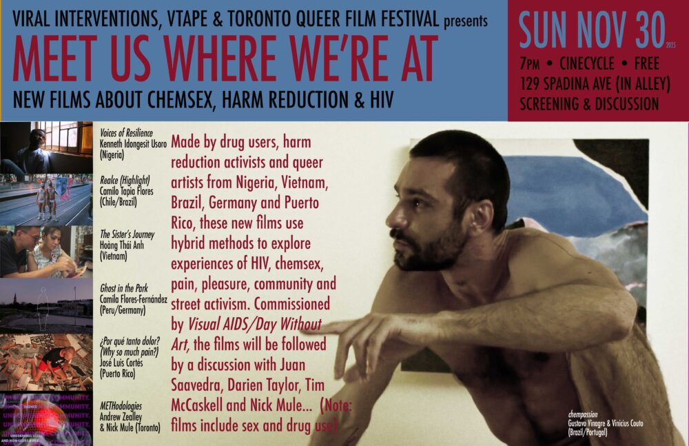 Sunday, Nov. 30 at 7:00 p.m., join as at CineCycle (129 Spadina Ave., rear) for MEET US WHERE WE'RE AT, the annual Day With(out) Art screening. Made by drug users, harm reduction activists and queer artists from Nigeria, Vietnam, Brazil, Germany and Puerto Rico, these new films use hybrid methods to explore experiences of chemsex, pain, pleasure, community and street activism.