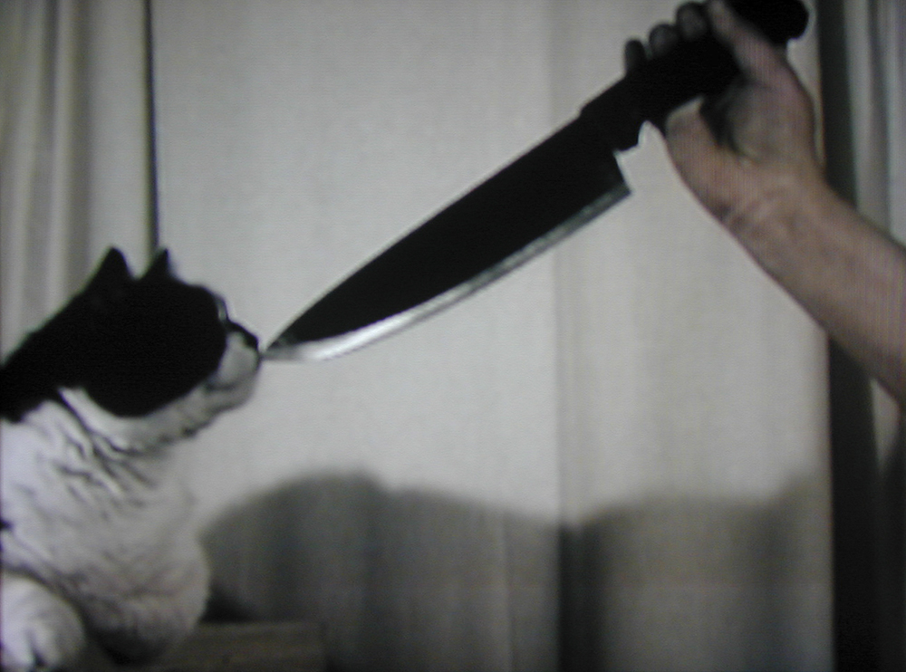 A cat is presented with a sequence of everyday items to sniff. Single channel video.