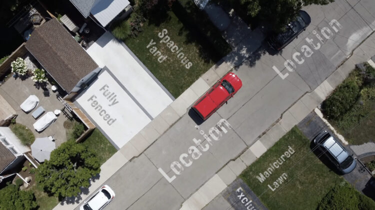 An ironic, top-down summary of the language used in real estate superimposed on a Canadian neighbourhood.