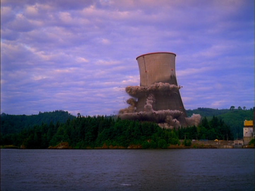 "The astonishing five-minute color film was shot in 35MM and transferred to video, sporting a perfectly synched musical score by Quasi's Sam Coomes. No narrative, just a picturesque haunting reminder of our lives under the totem of a nuclear state. Long defunct, the monumental tower was imploded earlier this year and Renwick (of Oregon Department of Kick Ass) decided to capture the haunting silhouette that has simply stood there menacingly for years. She calmly documents its demise, which is very much an anti-climax. The short film adores its subject, the towering cement structure. Over a varying course of time, with lapse and stills we view a building painted in pastel light, stark at night, at dawn and dusk. Its inevitable course in its history would be told through a moment in time when it was no more. In essence, the very moment of implosion infers the ultimate destructive potential of its former chilling power. The film, shot by veteran cameraman Eric Alan Edwards (To Die For, Copland, The Break-Up), is stunning to watch, and perfectly blunt." - TJ Norris