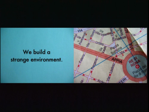 Map of the City is a two channel video installation that explores the notion of building-as-book. Initiated during a six-month residency in Rome, this work sees the city as a text environment that requires both readers and writers. Urban space is compared to a library. This work is inspired by chapels and cathedrals, which act as three-dimensional, immersive representations of the Bible. Quotes from The Gospel of Thomas and The Bible are interwoven with original text, still photos and electronic soundscapes. The city is seen as an accumulation of gestures and desires that outstrip the life of the individual, This work was premiered at the Art Gallery of Calgary in the summer of 2007.