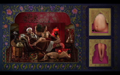 In an undisclosed Republic, where the index of freedom is 222% and people's satisfaction with the government is 458%, a misguided people nonetheless are protesting in the streets. An apathetic Citizen lounges at home watching TV, oblivious to the growing chants outside his window. In the meantime, a Mullah sits among naked mistresses in his harem. Disturbed by the protest's developments, he repeatedly phones a prison Guard and orders him to escalate the brutal torture methods on the captured protesters. Expressed through a collage of cropped video images that unify to create three alternating cubist video canvases, Republic of God is a satirical portrayal of the relationship between ruler and subject in a day of political turmoil set in a fictitious nation.