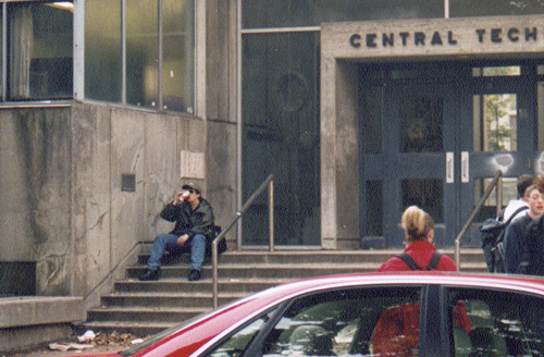 Everyday for one month I arrived at the front of the school at the exact same time, wearing the same clothes and sitting on the same step. Then as the students began to arrive, I began my performace of a pre-set routine of simple everyday actions. I smoked a cigarette, took sips from my coffee, looked to the left, stretched my leg, adjusted my hat, read the same five pages from a book and underlined the same passage etc... Although appearing to be moving and acting in a completely natural and spontaneous way I was in fact, with the aid of a pre-recorded audio track on headphones, completing the exact same actions and gestures everyday at exactly the same time. For one month I entered into the normal daily routine of the people around me as a background element... a small anonymous deja-vu experience.