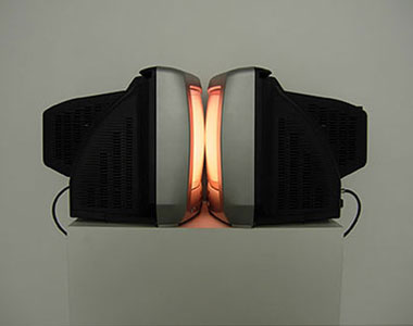 "Multi-media artist Kelly Mark has long been interested in the obsession of television in our culture and in technology’s gradual replacement of human interaction. Her light box entitled The Kiss was derived from an installation included in her Glow Video Series that Mark produced using reflected light as a primary material. The installation consisted of two television screens positioned as if 'kissing' and emanating a glowing, flesh-toned light between them. 'The light source for this work was created by simply recording the cast light from a hard core porn movie…the resulting glow is steady and rhythmic with quickening pulses of colour, mainly pinks, oranges and red hues.'